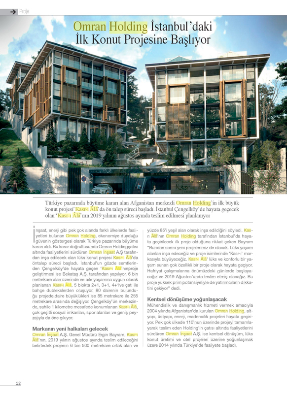 İnşaat, enerji gibi pek çok alanda farklı ülkelerde faaliyetleri bulunan Omran Holding, ekonomiye duyduğu güvenin göstergesi olarak Türkiye pazarında büyüme kararı aldı. Bu karar doğrultusunda Omran Holding çatısı altında faaliyetlerini sürdüren Omran İnşaat A.Ş tarafından inşa edilecek olan lüks konut projesi Kasr-ı Âlâ'da ön talep süreci başladı. İstanbul'un gözde semtlerinden Çengelköy'de hayata geçen 'Kasr-ı Âlâ'nın proje geliştirmesi ise Bekataş A.Ş. tarafından yapılıyor. 6 bin metrekare alan üzerinde ve aile yaşamına uygun olarak planlanan Kasr-ı Âlâ, 5 blokta 2+1, 3+1, 4+1 ve çatı ile bahçe dublekslerden oluşuyor. 80 dairenin bulunduğu projede, daire büyüklükleri ise 85 metrekare ile 255 metrekare arasında değişiyor. Çengelköy'ün merkezinde, sahile 1 kilometre mesafede konumlanan Kasr-ı Âlâ, çok çeşitli sosyal imkanları, spor alanları ve geniş peyzajıyla da öne çıkıyor.