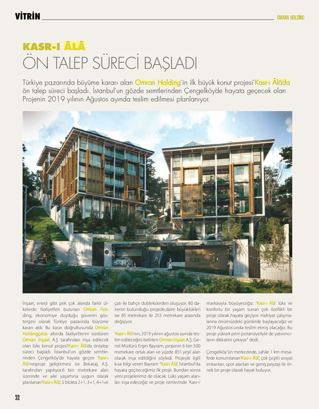 Türkiye pazarında büyüme kararı alan Omran Holding'in ilk büyük konut projesi Kasr-ı Âlâ’da ön talep süreci başladı. İstanbul'un gözde semtlerinden Çengelköy’de hayata geçecek olan Projenin 2019 yılının Ağustos ayında teslim edilmesi planlanıyor.